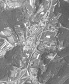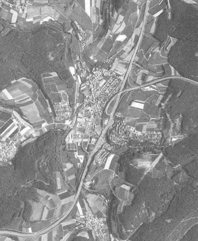 Hier sind wir zu hause. Ein Foto von sehr weit oben.Kirchheim in Hessen. Die Landschaft entstellt von einem Autobahndreieck und einer Schnellbahn mit den dazugehörigen Betonbrücken im Baustil der heutigen Zeit.